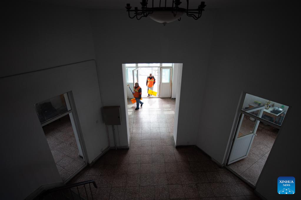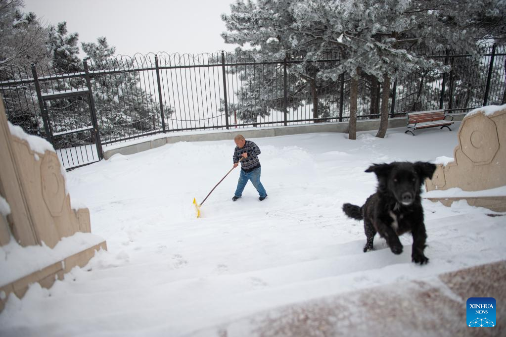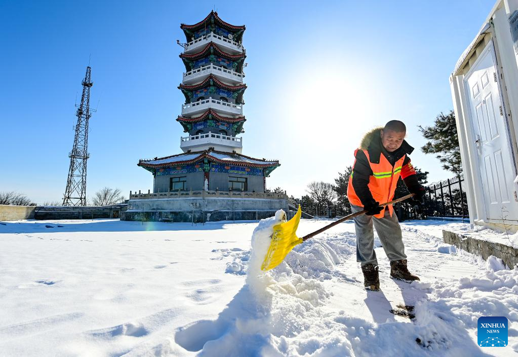 Song Chen cleans the snow in the yard outside the watchtower on Mangshan Mountain in Beijing, capital of China, March 19, 2022.