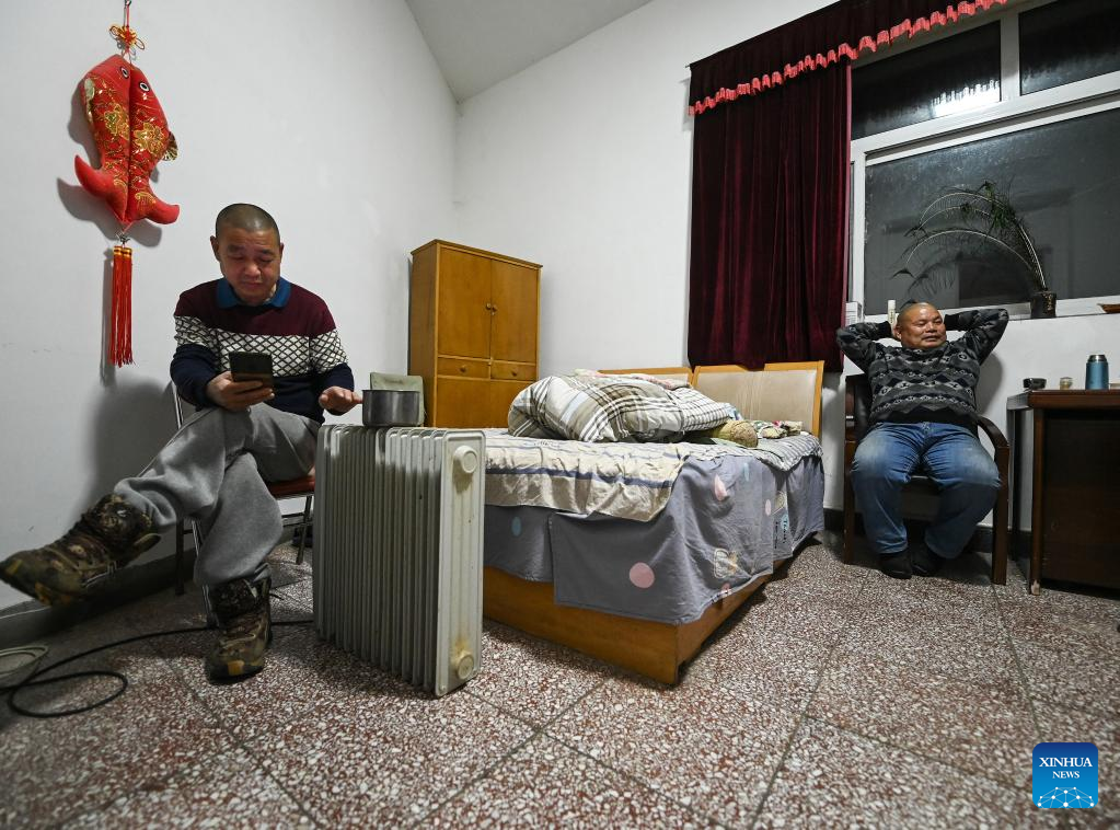 Song Chen (L) checks his cellphone while Song Bao watches television at the dormitory in the watchtower on Mangshan Mountain in Beijing, capital of China, March 18, 2022.