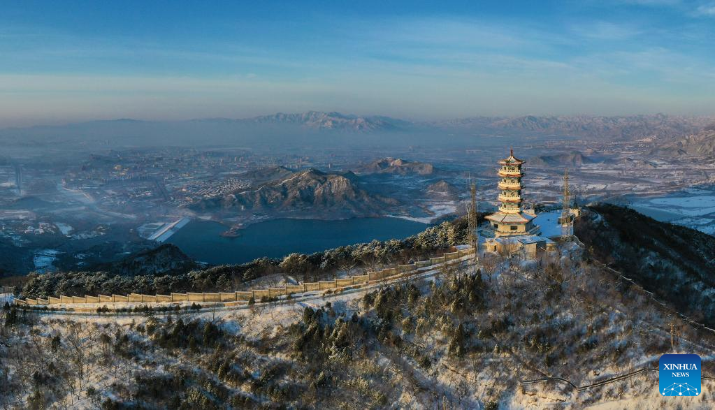 Aerial photo taken on March 19, 2022 shows the watchtower blanketed with snow on Mangshan Mountain in Beijing, capital of China.