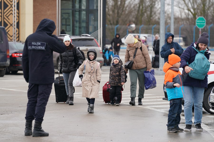 A staff member prepares to check people from Ukraine at Palanca checkpoint, Moldova, March 2, 2022. (Xinhua/Wang Qing)