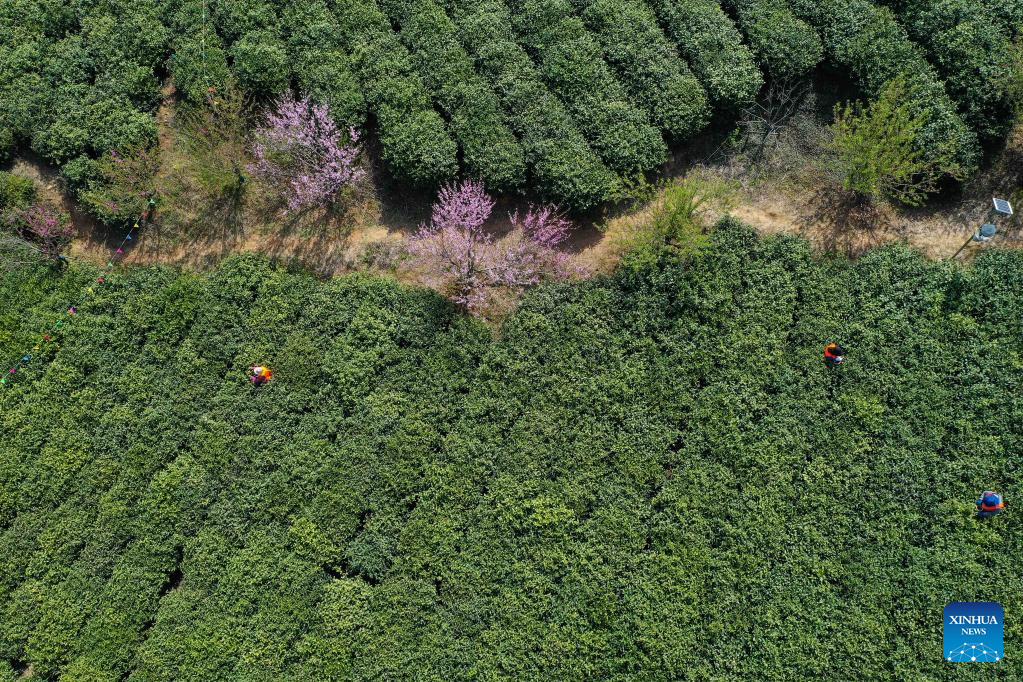 Aerial photo taken on March 29, 2022 shows workers picking tea leaves in a tea garden in Jiangning District of Nanjing, east China's Jiangsu Province. Traditionally, Chinese value tea made from the very first tea sprouts in spring that should be picked up before Qingming Festival, which falls on April 5 this year. (Xinhua/Ji Chunpeng)