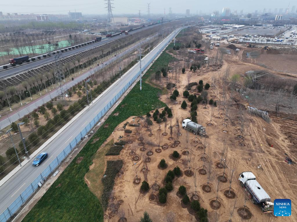 Aerial photo taken on March 29, 2022 shows the construction site of Minglangnan Street in Xiong'an New Area, north China's Hebei Province. The upgrading construction of Minglangnan Street is scheduled to complete in September. (Xinhua/Xing Guangli)