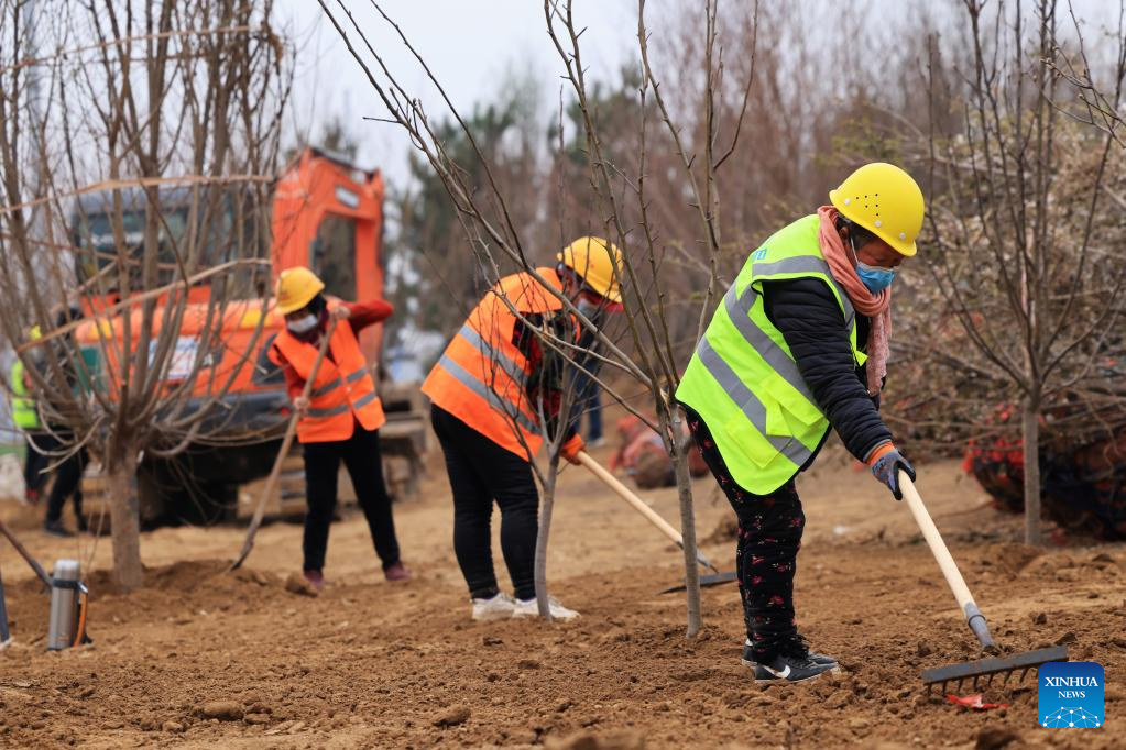 Workers are seen at the construction site of Minglangnan Street in Xiong'an New Area, north China's Hebei Province, March 29, 2022. The upgrading construction of Minglangnan Street is scheduled to complete in September. (Xinhua/Xing Guangli)