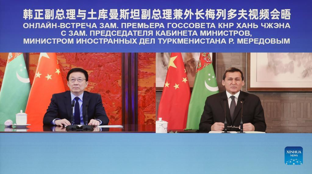 BEIJING, March 30 (Xinhua) -- Chinese Vice Premier Han Zheng Wednesday met with Turkmen Deputy Prime Minister and Foreign Minister Rashid Meredov via video link, calling for enhanced cooperation in specific fields, including natural gas, security, and people-to-people exchanges.