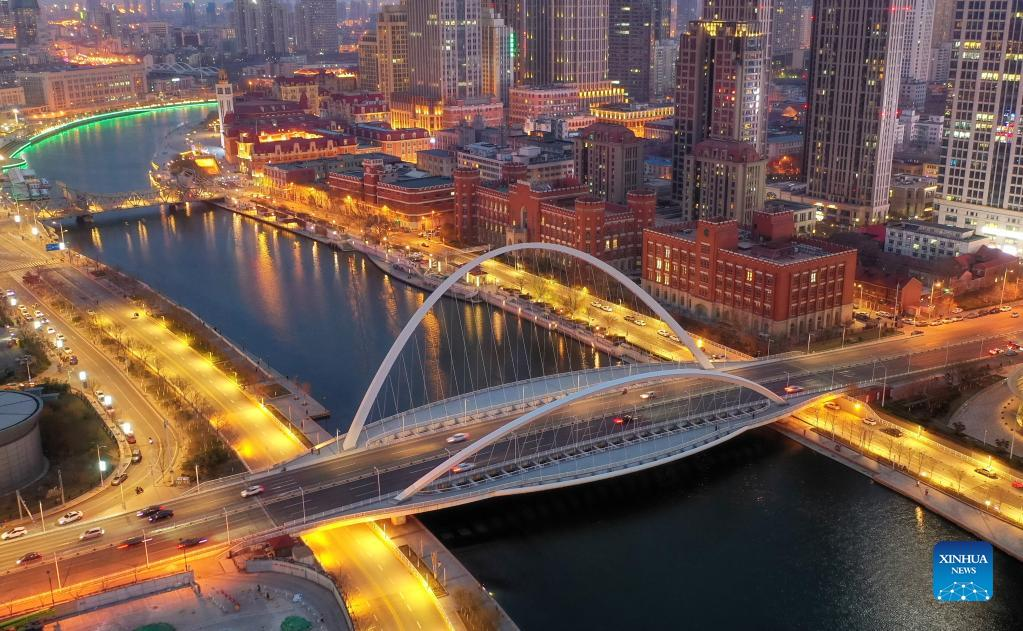 Aerial photo taken on March 26, 2022 shows bridges over the Haihe River in north China's Tianjin. (Xinhua/Sun Fanyue)