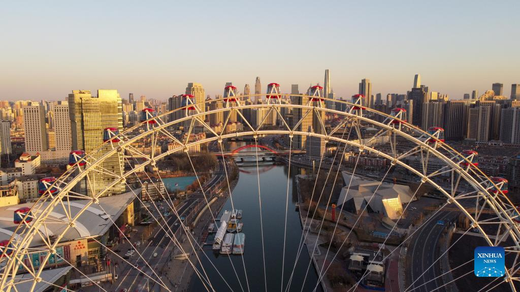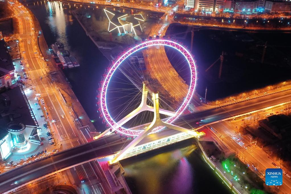 Aerial photo taken on March 27, 2022 shows a ferry wheel on Yongle bridge over the Haihe River in north China's Tianjin. (Xinhua/Sun Fanyue)