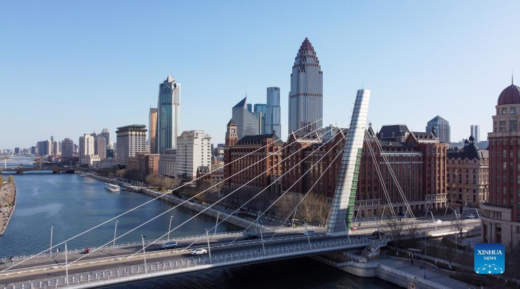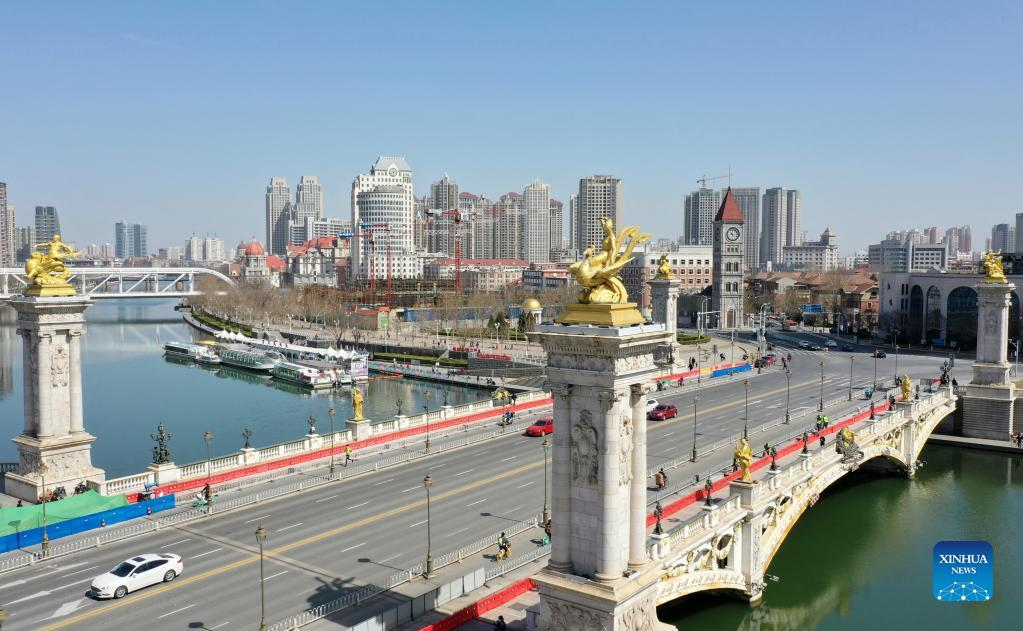 Aerial photo taken on March 27, 2022 shows the Yongle bridge over the Haihe River in north China's Tianjin. (Xinhua/Sun Fanyue)