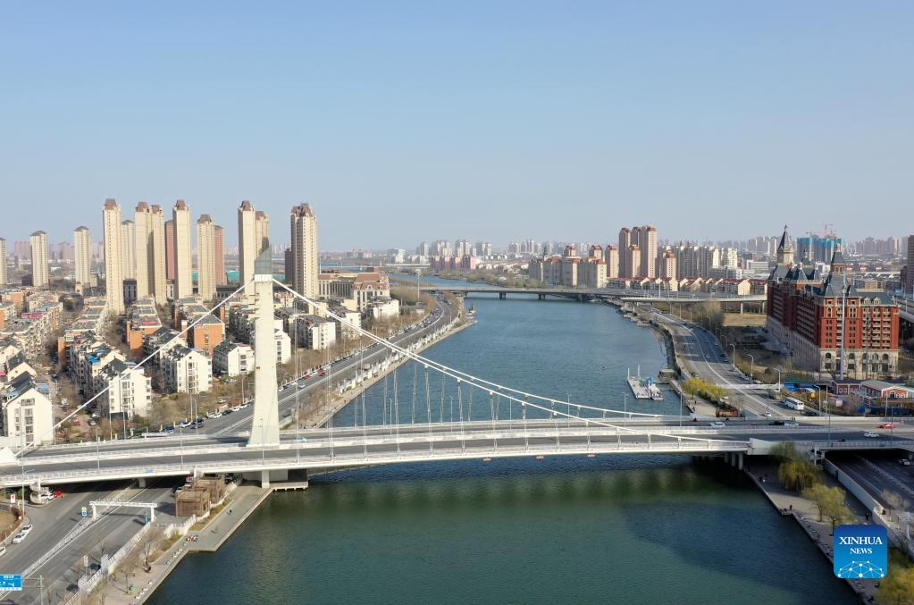 Aerial photo taken on March 26, 2022 shows the Jintang bridge (front) over the Haihe River in north China's Tianjin. (Xinhua/Sun Fanyue)