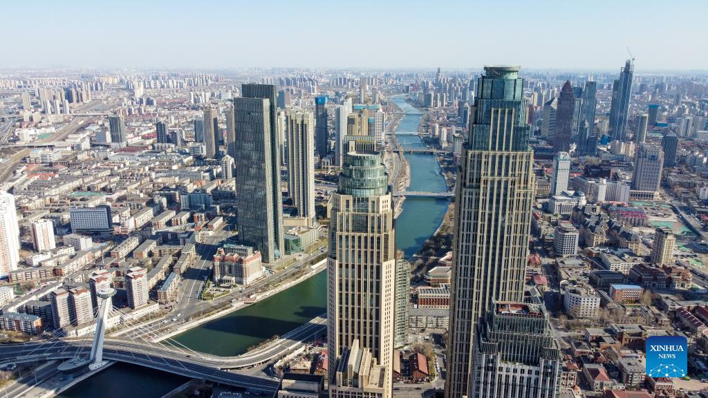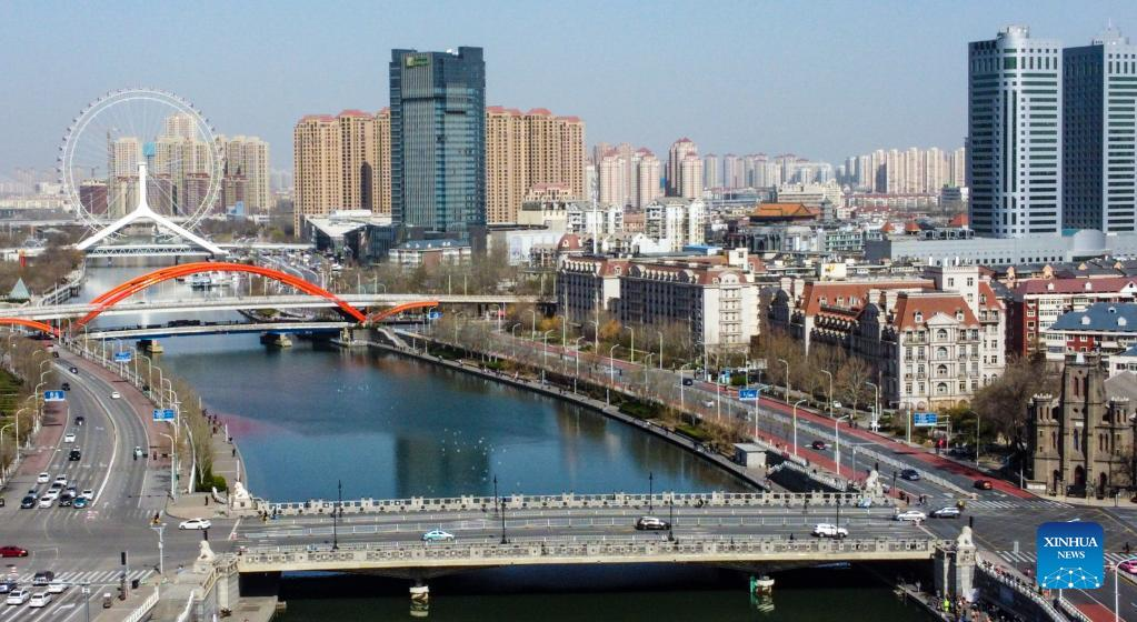 Aerial photo taken on March 27, 2022 shows bridges over the Haihe River in north China's Tianjin. (Xinhua/Sun Fanyue)