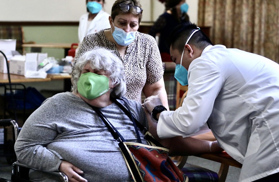 File photo taken on Jan. 15, 2021 shows a resident receiving a dose of COVID-19 vaccine in Pasadena, Los Angeles County, California, the United States. (Xinhua)