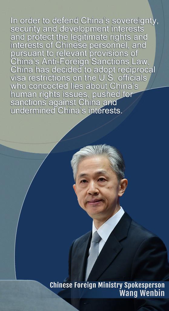 In order to defend China's sovereignty, security and development interests and protect the legitimate rights and interests of Chinese personnel, and pursuant to relevant provisions of China's Anti-Foreign Sanctions Law, China has decided to adopt reciprocal visa restrictions on the U.S. officials who concocted lies about China's human rights issues, pushed for sanctions against China and undermined China's interests, Wang said.