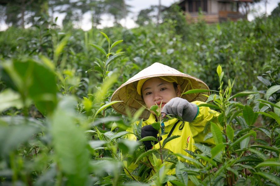 Photo taken on March 24, 2022, shows villager picking tea leaves at the tea plantation of 36 Manor in Bolaven Plateau, south Laos. (Photo by Kaikeo Saiyasane/Xinhua)