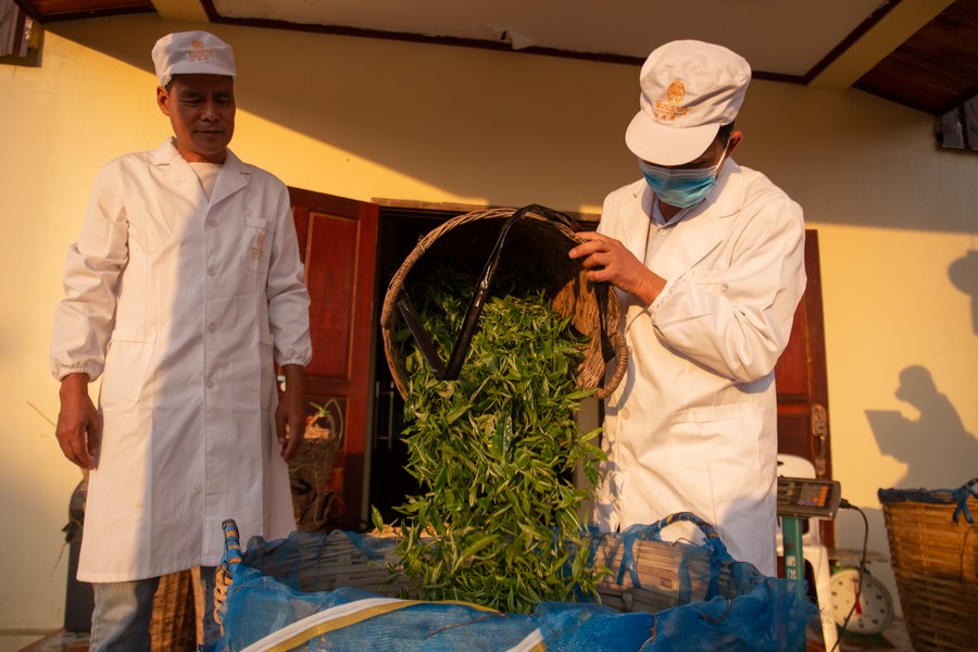 Photo taken on March 25, 2022, shows the 36 Manor's factory collects tea picked by the villagers in Bolaven Plateau, south Laos. (Photo by Kaikeo Saiyasane/Xinhua)