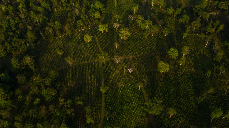 Aerial photo taken on March 25, 2022, shows the view of the tea plantation of 36 Manor in Bolaven Plateau, south Laos. (Photo by Kaikeo Saiyasane/Xinhua)