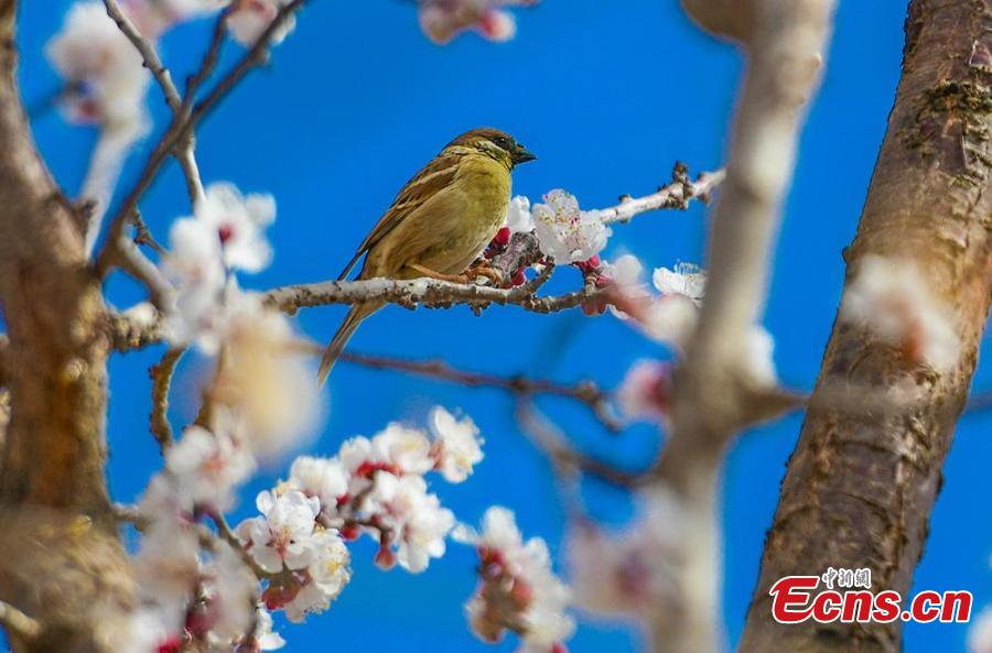A bird stands on a branch of a apricot blossom tree in Dunhuang, northwest China's Gansu Province in March. (Photo: China News Service/Wang Binyin)