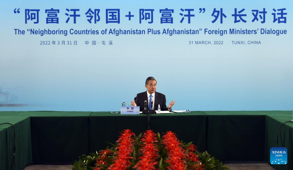 Chinese State Councilor and Foreign Minister Wang Yi chairs the "Afghanistan's neighbors + Afghanistan" foreign ministers' dialogue in Tunxi, east China's Anhui Province, March 31, 2022. Acting Foreign Minister of the Afghan Interim Government Amir Khan Muttaqi was in attendance alongside foreign ministers and representatives of member states of the mechanism of coordination and cooperation among Afghanistan's neighboring countries. Qatari Deputy Prime Minister and Foreign Minister Sheikh Mohammed bin Abdulrahman Al Thani and Indonesian Foreign Minister Retno Marsudi were invited as guests. (Xinhua/Zhou Mu)