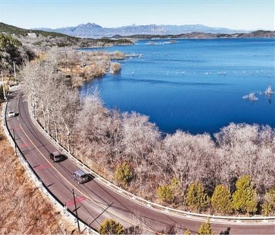 Photo shows a road located in the south of Miyun Reservoir in Miyun district, Beijing. Stretching near mountains and along the lakeside, the road connects various scenic spots in the locality, being a favorite route of self-driving tourists and cyclists. (People’s Daily/He Yong)