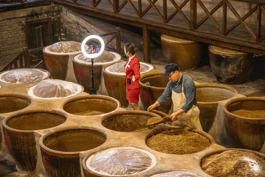 A staff member introduces vinegar-making through livestreaming at a vinegar museum in Zhenjiang, east China's Jiangsu Province, April 20, 2020. (Photo by Feng Jiangjiang/Xinhua)