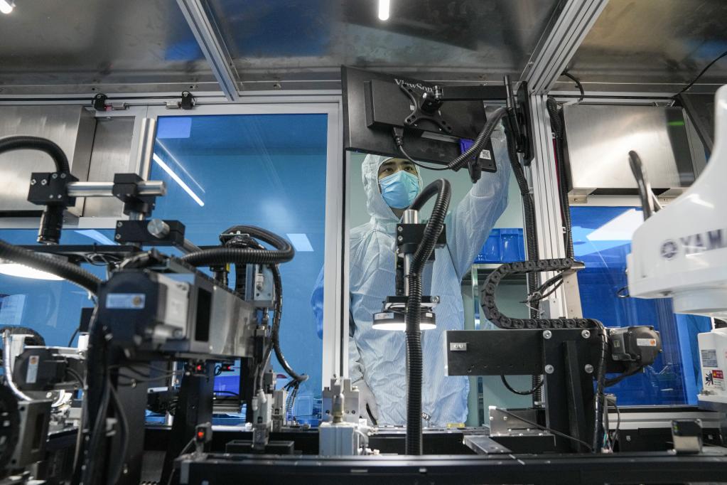 A staff member works at a production line of COVID-19 self-testing kits at Biouhan healthcare company in Hefei, east China's Anhui Province, March 29, 2022. Since March 11, China has added antigen detection as an option for COVID-19 testing among the public. Such kits are already seen in drug stores, online platforms and multiple detection scenarios in China. With a capacity of up to 10 million kits per day, Biouhan healthcare company is a major manufacturer of COVID-19 antigen self-testing kits in east China's Anhui Province. The testing kits have been used in transportation hubs in Hefei, Anhui Province. (Xinhua/Du Yu)