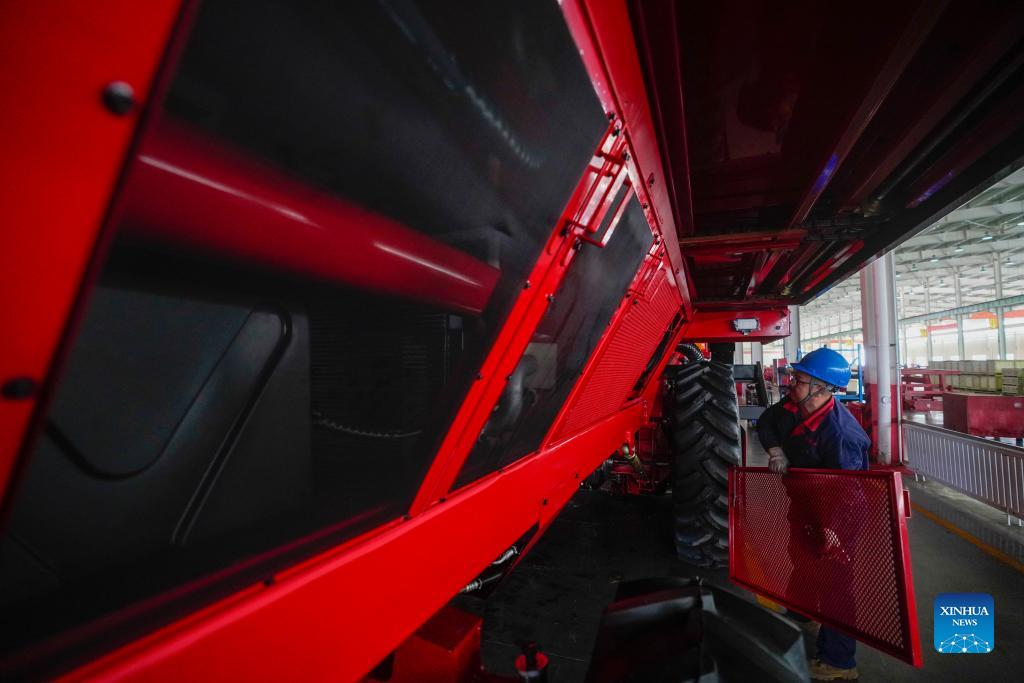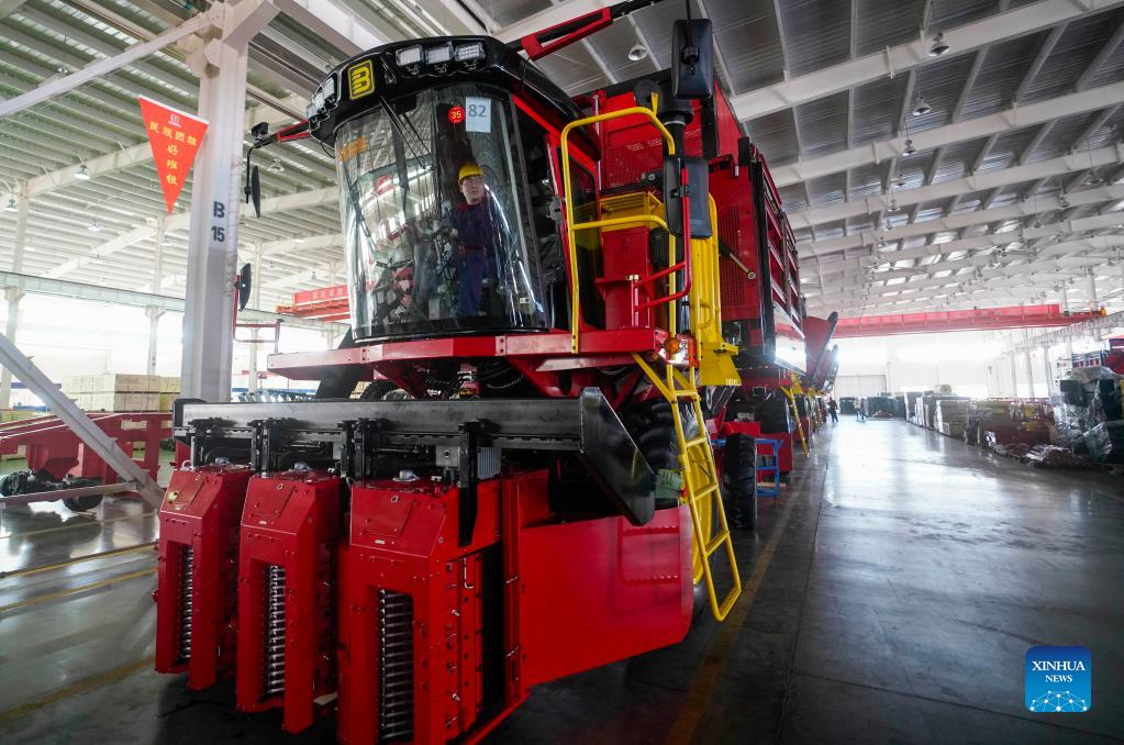 A worker inspects a cotton picker at Xinjiang Boshiran Intelligent Agricultural Machinery Co., Ltd. in Tacheng, northwest China's Xinjiang Uygur Autonomous Region, March 31, 2022. The production of domestically-made cotton pickers reaches its peak in Xinjiang as spring farming goes in full swing across the country. In 2021, machines performed over 80 percent of the cotton-picking work in the region, with the harvesting in northern Xinjiang nearly entirely mechanized, according to the regional agricultural authority. (Xinhua/Zhao Ge)