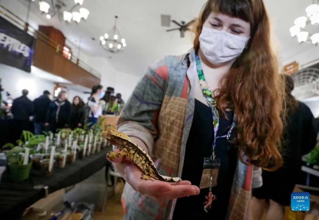 An exhibitor shows a pet gecko during the 2022 Vancouver Reptile Expo in Delta, British Columbia, Canada, on April 2, 2022. (Photo by Liang Sen/Xinhua)