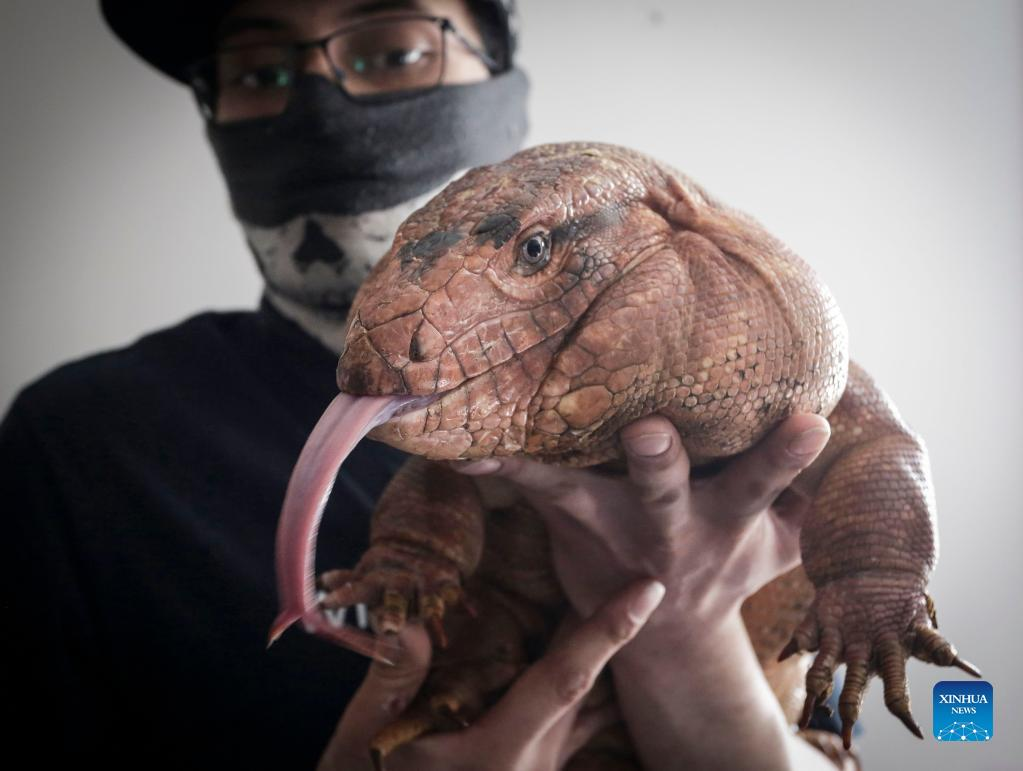 A man shows a red tegu during the 2022 Vancouver Reptile Expo in Delta, British Columbia, Canada, on April 2, 2022. (Photo by Liang Sen/Xinhua)