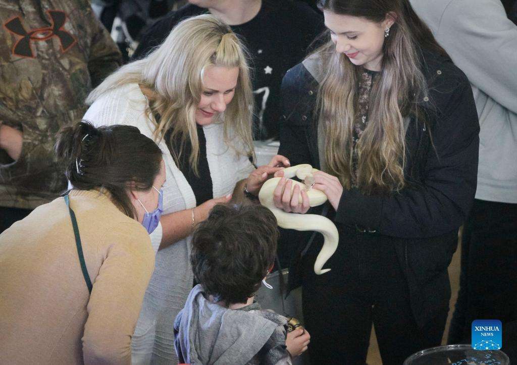 People look at pet snakes during the 2022 Vancouver Reptile Expo in Delta, British Columbia, Canada, on April 2, 2022. (Photo by Liang Sen/Xinhua)