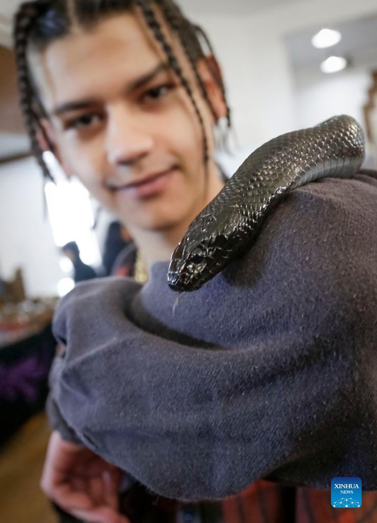 A man shows a pet snake during the 2022 Vancouver Reptile Expo in Delta, British Columbia, Canada, on April 2, 2022. (Photo by Liang Sen/Xinhua)