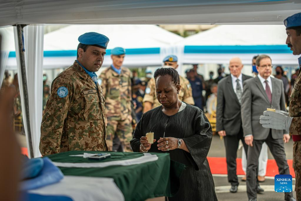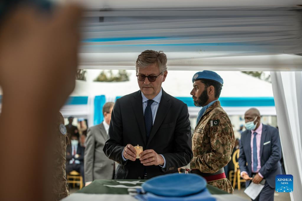 Peacekeepers attend a memorial service in Goma, the Democratic Republic of the Congo (DRC), on April 2, 2022. UN peacekeeping mission in the Democratic Republic of the Congo paid a final tribute Saturday to the eight peacekeepers who died during a helicopter crash Tuesday in northeastern DRC. (Photo by Zanem Nety Zaidi/Xinhua)