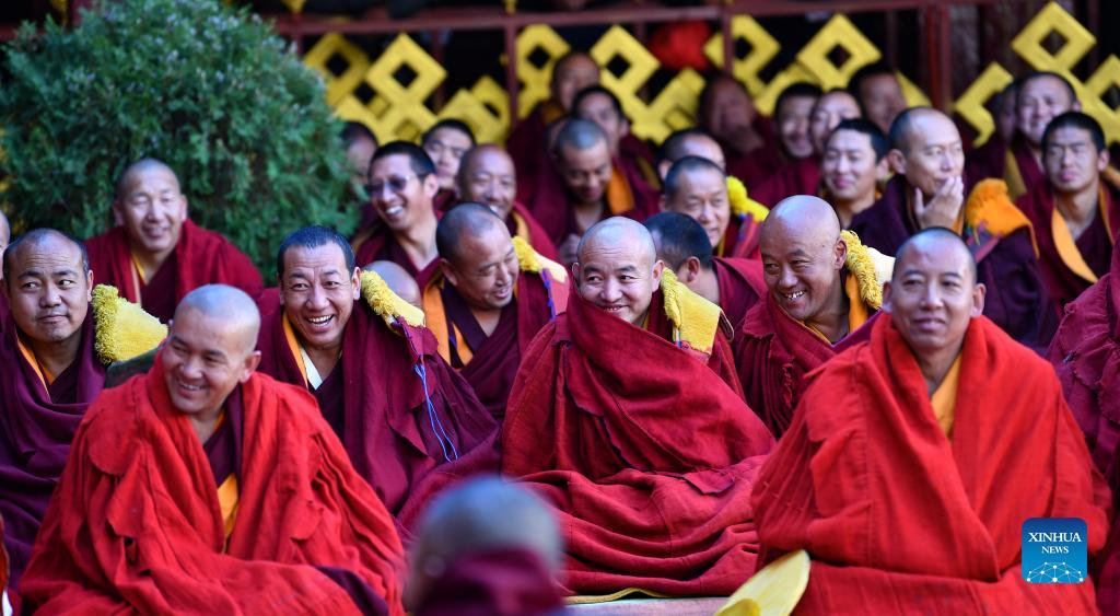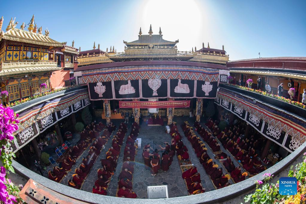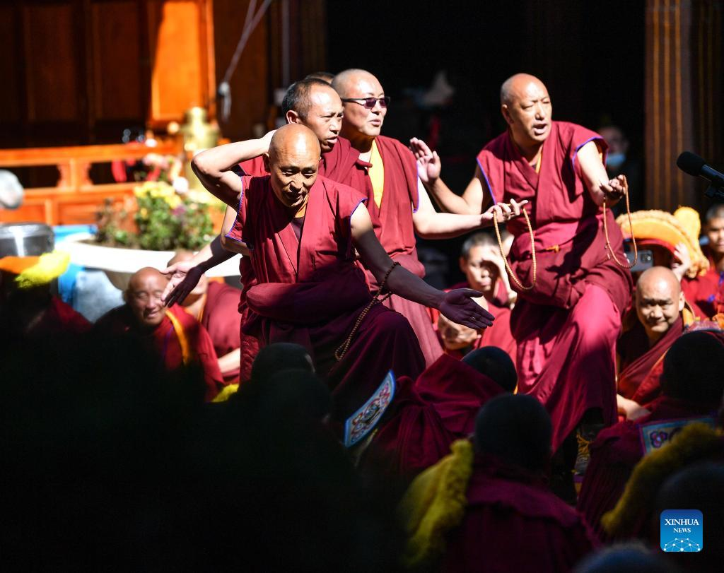 Monks attend the debate activity, a part of the award ceremony of the degree of Geshe Lharampa held in the Jokhang Temple in Lhasa, capital of southwest China's Tibet Autonomous Region, April 2, 2022. Thirteen monks were awarded the degree of Geshe Lharampa on Saturday in the Jokhang Temple in downtown Lhasa. Geshe Lharampa, which means "intellectual" in the Tibetan language, is the highest academic degree for the Gelugba School -- also known as the Yellow Sect -- of Tibetan Buddhism. The history of Geshe Lharampa goes back 400 years. (Xinhua/Jigme Dorje)