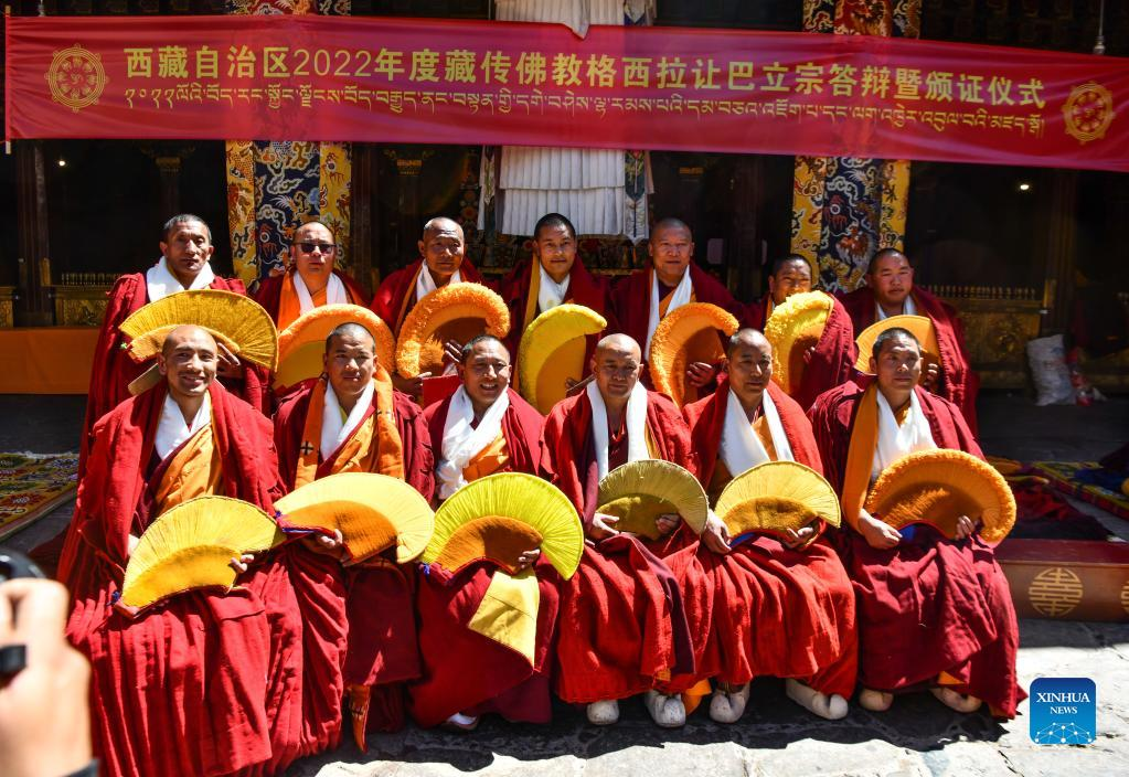 Monks awarded the degree of Geshe Lharampa pose for a group photo in the Jokhang Temple in Lhasa, capital of southwest China's Tibet Autonomous Region, April 2, 2022. Thirteen monks were awarded the degree of Geshe Lharampa on Saturday in the Jokhang Temple in downtown Lhasa. Geshe Lharampa, which means "intellectual" in the Tibetan language, is the highest academic degree for the Gelugba School -- also known as the Yellow Sect -- of Tibetan Buddhism. The history of Geshe Lharampa goes back 400 years. (Xinhua/Jigme Dorje)