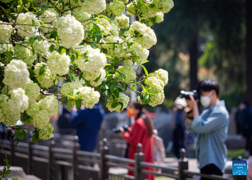 Tourists take pictures at a park in Nanjing, east China's Jiangsu Province, April 3, 2022. (Photo by Su Yang/Xinhua)