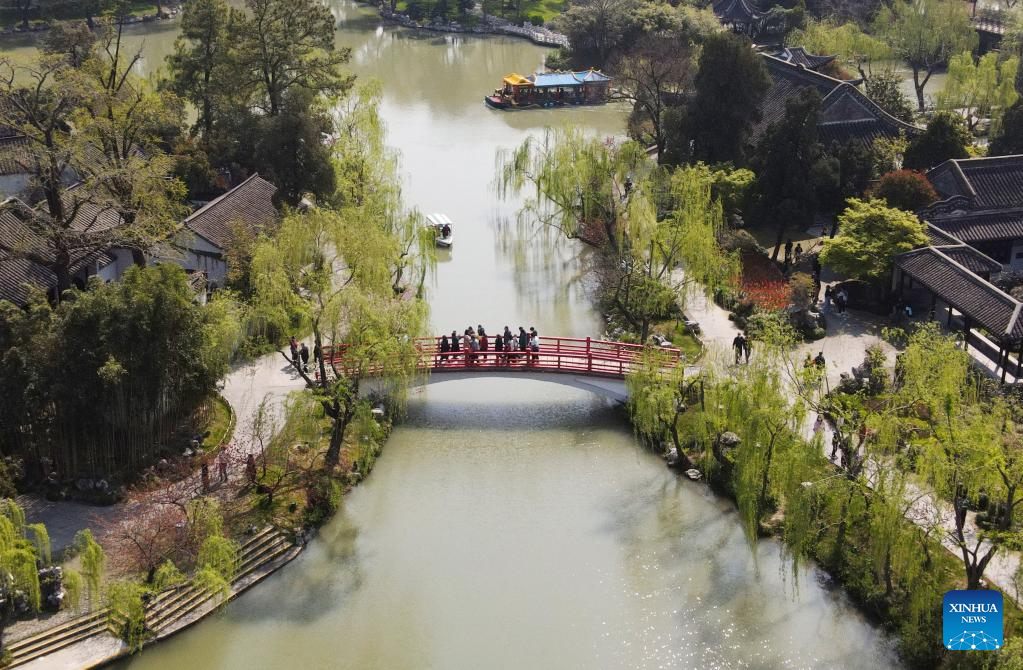 Aerial photo taken on April 3, 2022 shows people visiting the Slender West Lake scenic spot in Yangzhou, east China's Jiangsu Province. (Photo by Meng Delong/Xinhua)
