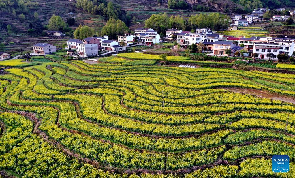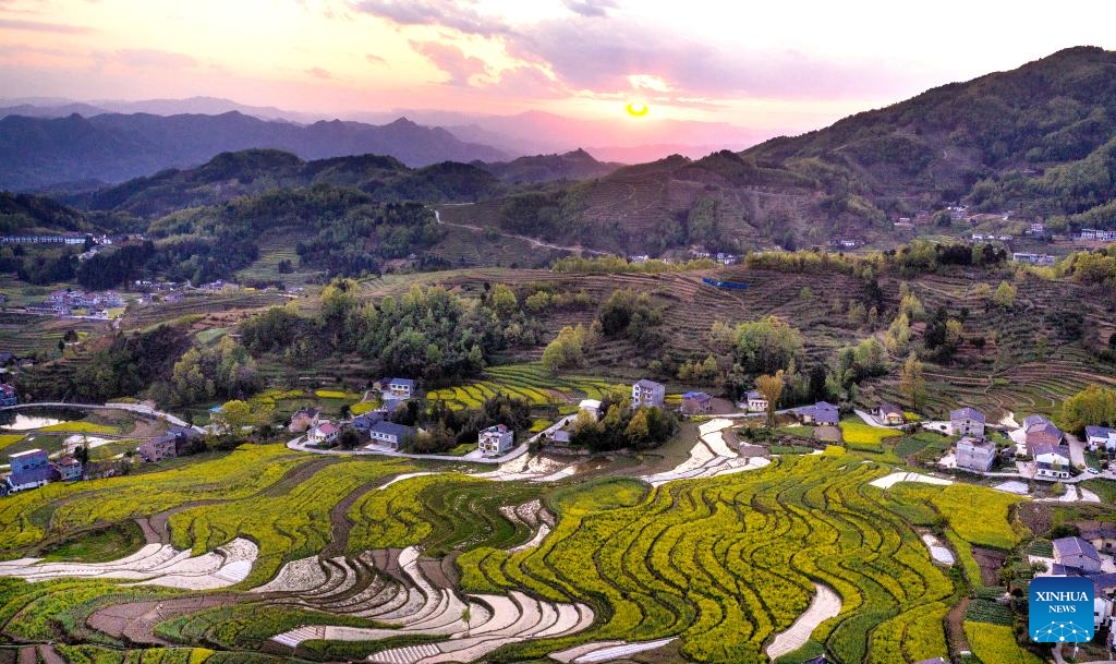 Aerial photo taken on April 3, 2022 shows the scenery of the terraced field in Ankang, northwest China's Shaanxi Province. (Xinhua/Tao Ming)
