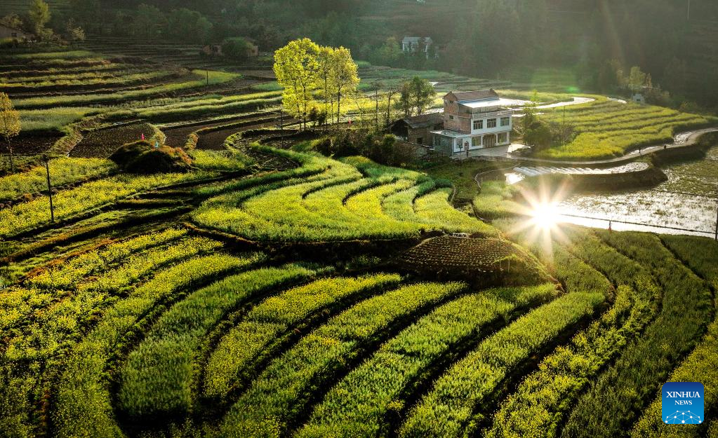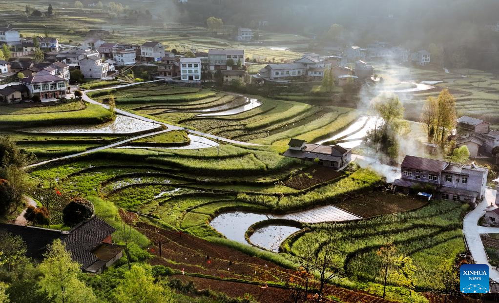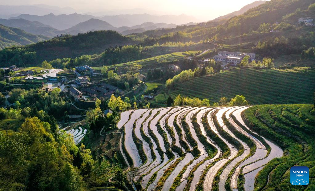 Aerial photo taken on April 2, 2022 shows the scenery of the terraced field in Ankang, northwest China's Shaanxi Province. (Xinhua/Tao Ming)