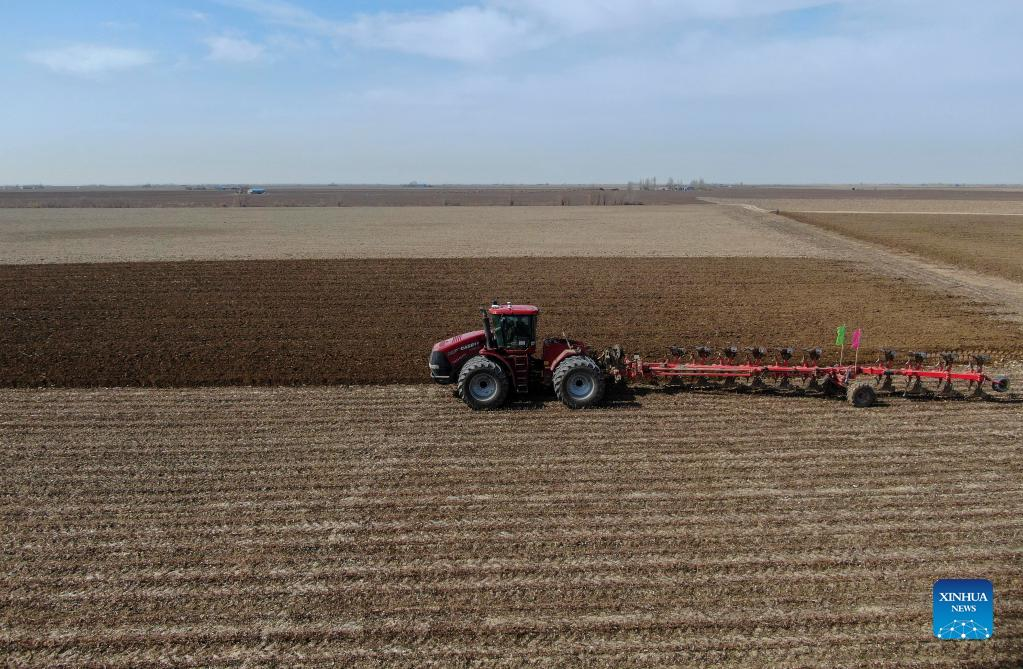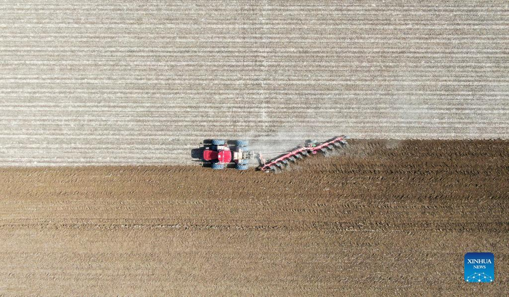 Aerial photo shows a tractor ploughing a cotton field in Shawan City, northwest China's Xinjiang Uygur Autonomous Region, April 2, 2022. Spring farming has started in northern Xinjiang. In 2022, local authorities will strive to achieve a mechanization level of 85.7 percent for all crops in Xinjiang. (Xinhua/Zhao Ge)