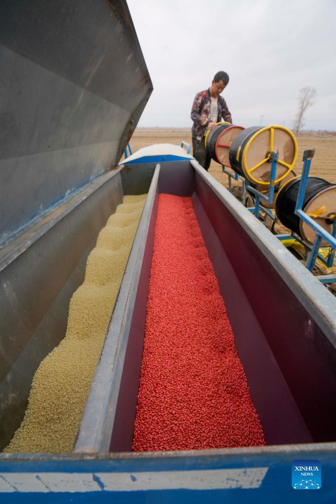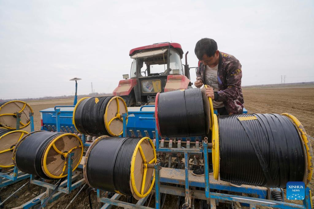 A farmer installs hoses for drip irrigation in a field in Wusu City, northwest China's Xinjiang Uygur Autonomous Region, March 31, 2022. Spring farming has started in northern Xinjiang. In 2022, local authorities will strive to achieve a mechanization level of 85.7 percent for all crops in Xinjiang. (Xinhua/Zhao Ge)
