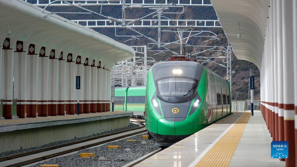 LHASA, April 4 (Xinhua) -- On a sunny spring day, a green Fuxing bullet train ran through the mountains along the Yarlung Zangbo River, heading for Nyingchi, a city known for its peach blossoms in southwest China's Tibet Autonomous Region.