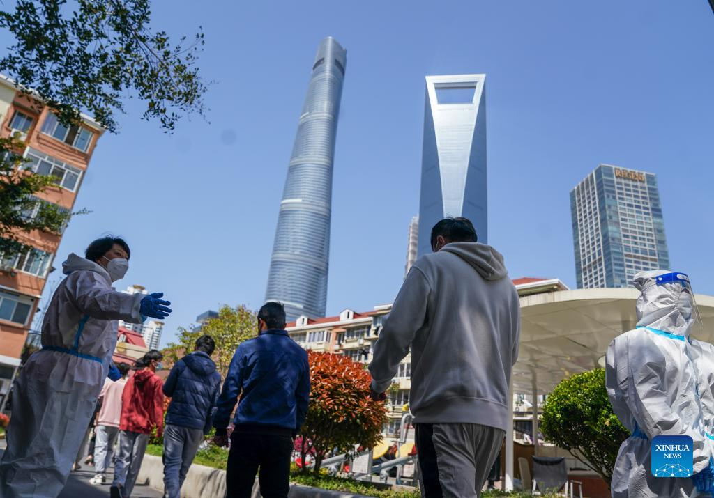 Residents wait to take nucleic acid tests at a community in Pudong New Area of east China's Shanghai, April 4, 2022. Amid rising numbers of COVID-19 infections in its latest resurgence, Shanghai on Monday launched a citywide nucleic acid testing campaign covering the city's more than 24 million residents. (Xinhua/Ding Ting)
