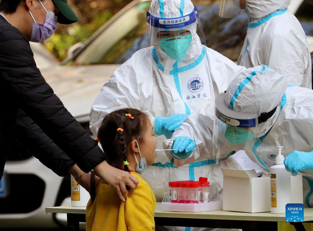 A medical worker from east China's Zhejiang Province takes a swab sample from a child for nucleic acid test at a community in Songjiang District of Shanghai, east China, April 4, 2022. Amid rising numbers of COVID-19 infections in its latest resurgence, Shanghai on Monday launched a citywide nucleic acid testing campaign covering the city's more than 24 million residents. (Xinhua/Zhang Jiansong)