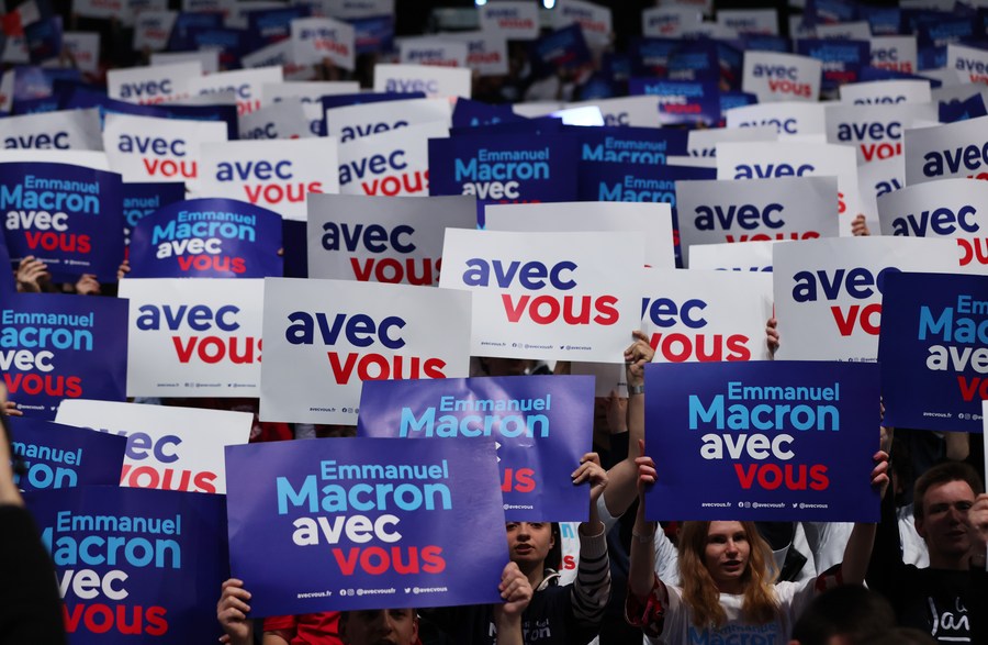 Supporters attend French President Emmanuel Macron's election campaign at the Paris La Defense Arena stadium, in Nanterre, on the outskirts of Paris, France, April 2, 2022. (Xinhua/Gao Jing)