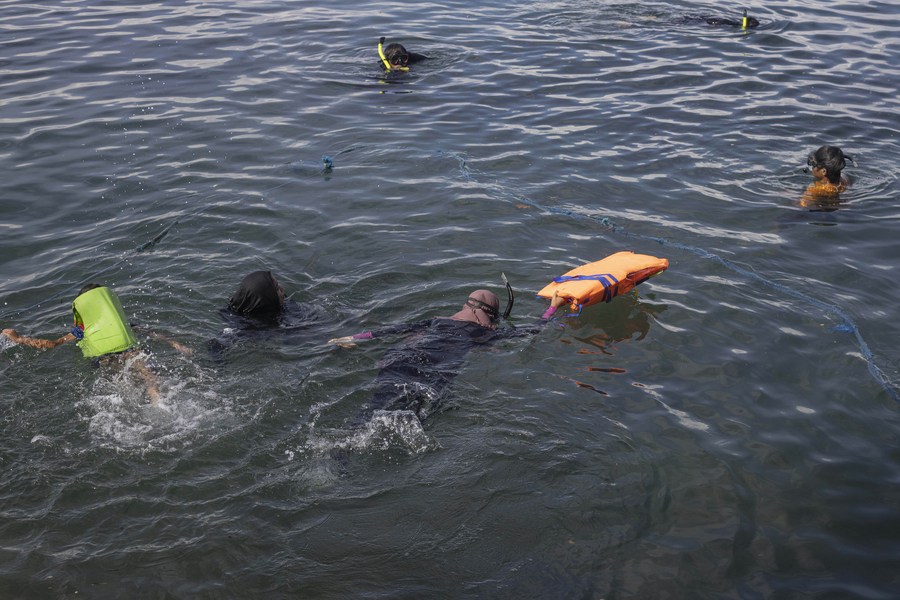 Volunteers swim to pick up plastic wastes during the Marine Debris Festival, held by the local community as a campaign to save the beach from plastics pollution, in Poliwali Mandar district, West Sulawesi, Indonesia, Oct. 3, 2021. (Photo by Yusuf Wahil/Xinhua)