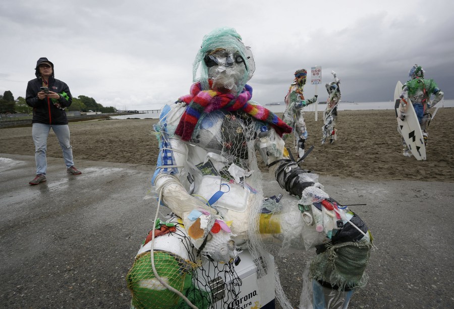 Figures made with plastics removed from shorelines are displayed at Kitsilano Beach in Vancouver, British Columbia, Canada, on June 6, 2021. (Photo by Liang Sen/Xinhua)