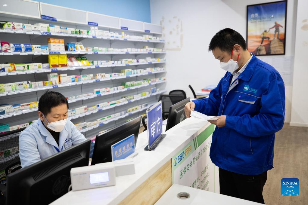 A car of Shanghai Pharma E Pharmacy delivers medicines in Shanghai, east China, April 5, 2022. During the temporary closed-off management period in Shanghai, supply and delivery of special drugs to those patients who need them is particularly important. A pharmacy called Shanghai Pharma E Pharmacy, which sells more than 260 new drugs, special drugs and drugs for rare diseases, stays in business to supply and deliver the medicines. (Xinhua/Jin Liwang)