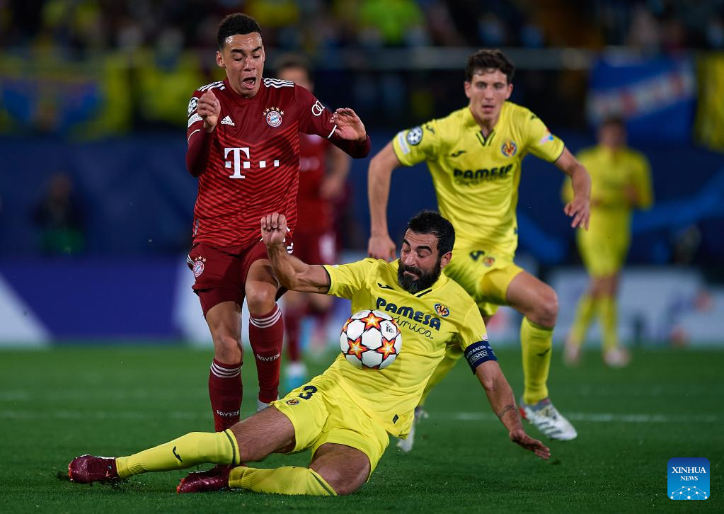 Raul Albiol (bottom) of Villarreal vies with Jamal Musiala of Bayern Munich during a UEFA Champions League match between Villarreal CF of Spain and Bayern Munich of Germany at La Ceramica Stadium in Vila-Real, Spain, on April 6, 2022. (str/Xinhua)