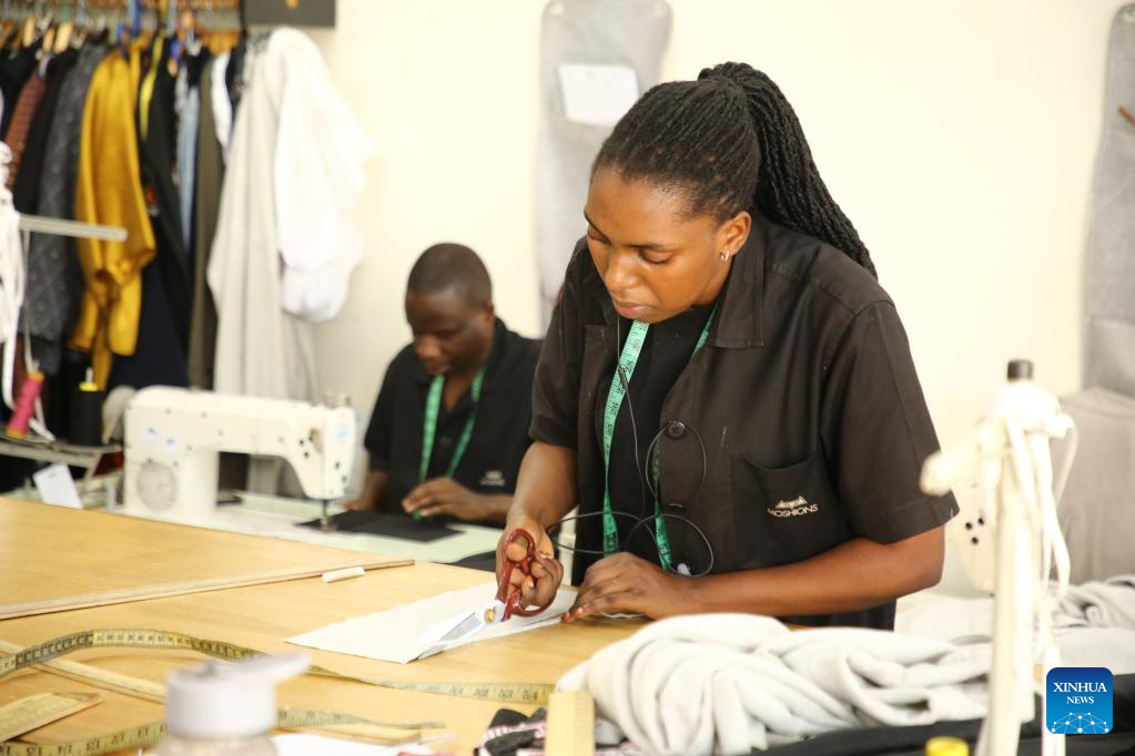 A staff member makes clothes at upstairs of the Moshions shop in Kigali, Rwanda on April 1, 2022. (Photo by Huang Wanqing/Xinhua)