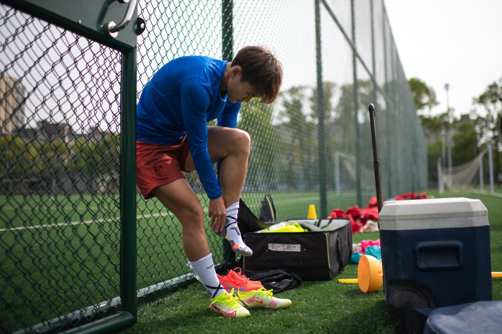 Chinese female football player Wang Shuang attends a training session in Wuhan of central China's Hubei Province, on April 6, 2022. (Xinhua/Xiao Yijiu)