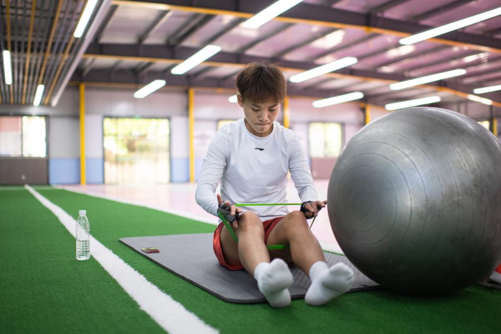 Chinese female football player Wang Shuang reacts after a training session in Wuhan of central China's Hubei Province, on April 6, 2022. (Xinhua/Xiao Yijiu)