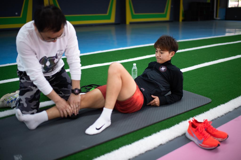 Chinese female football player Wang Shuang (L) talks to her physical therapist during a training session in Wuhan of central China's Hubei Province, on April 6, 2022. (Xinhua/Xiao Yijiu)