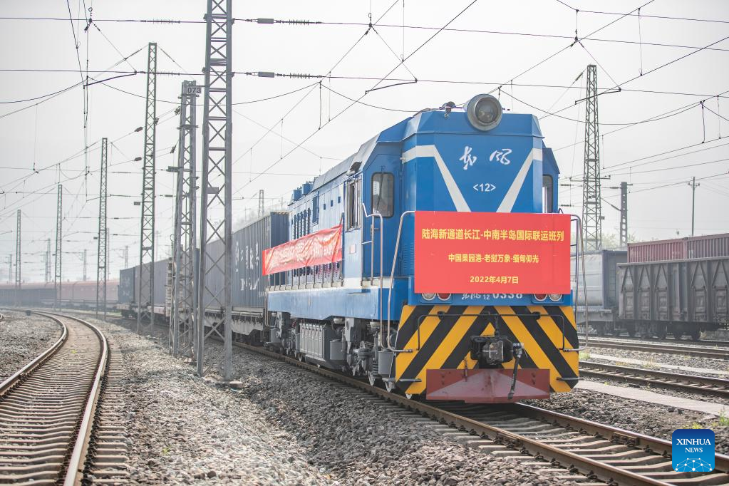 The first outbound international rail-sea freight train from China's Yangtze River to Indo-China Peninsula prepares to leave Guoyuan Port in southwest China's Chongqing Municipality for Myanmar's Yangon, April 7, 2022.